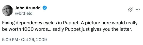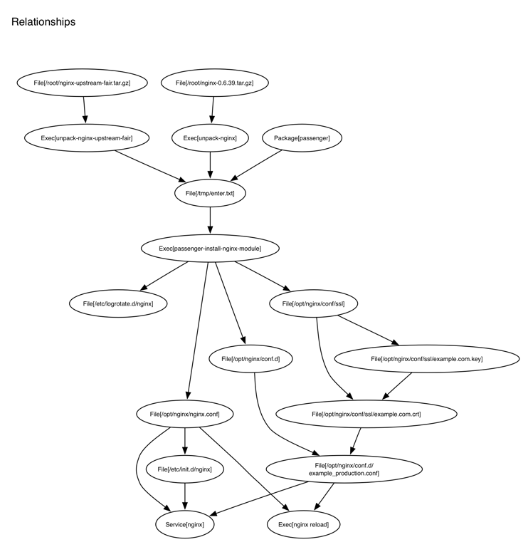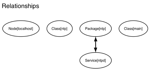 relationships: Package[ntp] => Service[ntpd], Service[ntpd] => Package[ntp]When the chain of dependencies is a long one, it can be hard to debug this. I tweeted mournfully that a diagram of the dependencies would be useful: