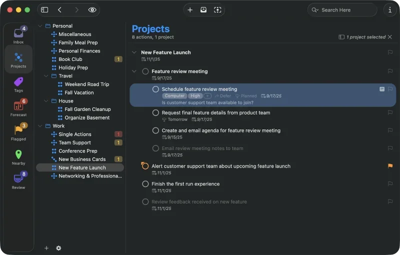 OmniFocus is the all-singing, all-dancing task manager I’ve used for decades. It syncs across all my devices. I run my life, business, books, and software projects on it. It’s one of the best-value things I’ve ever bought. Not affiliated; I just like it.
