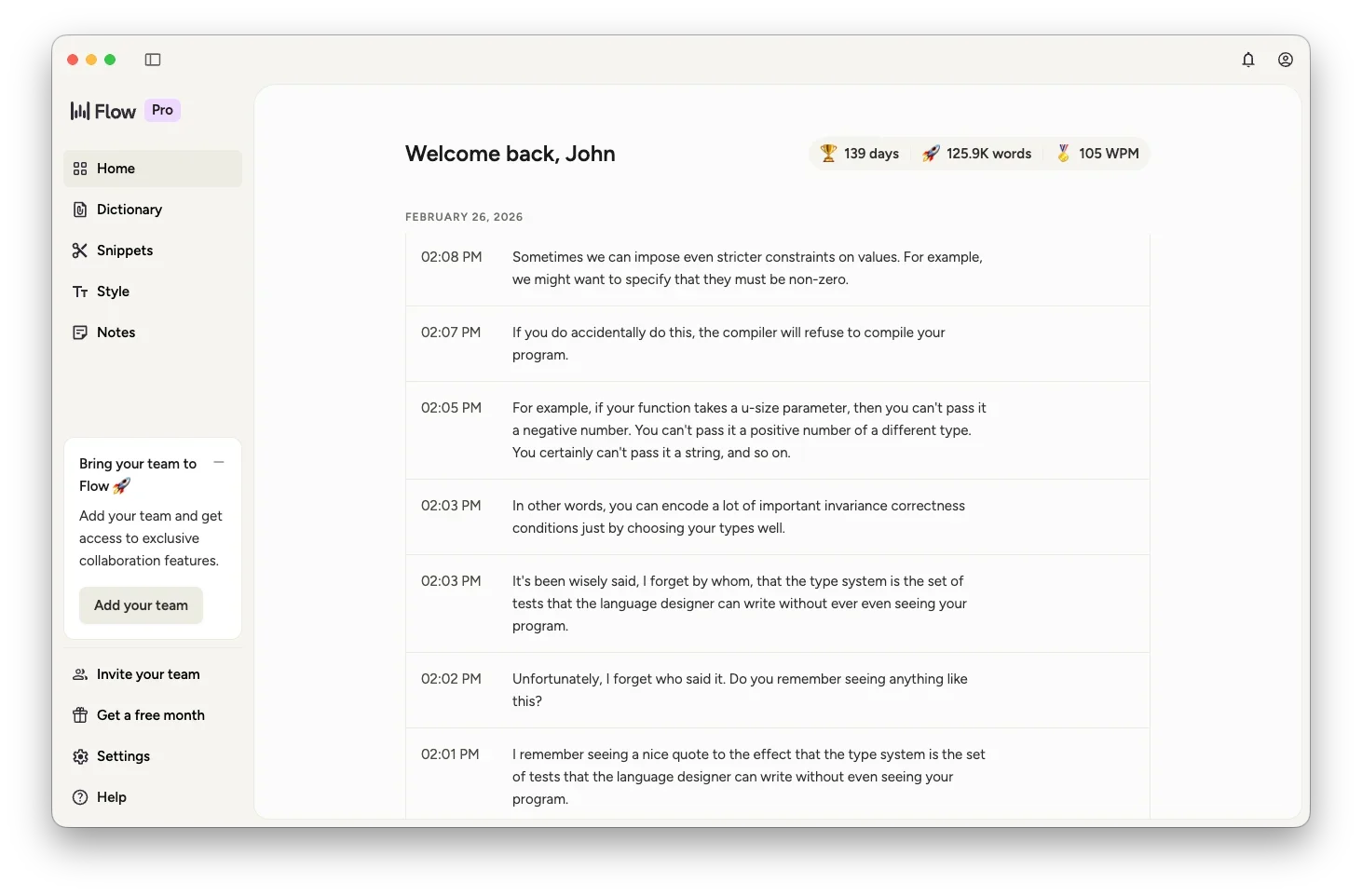 AI interaction. I use ChatGPT’s built-in speech-to-text feature a lot, but whenever I’m interacting with AI somewhere that doesn’t have that, such as the Zed agent panel, I can use Wispr Flow to speak my prompts. Now I wince when I see someone painfully and slowly typing out “w-h-a-t-d-o-e-s-t-h-i-s-e-r-r-o-r-m-e-s-s-a-g-e-m-e-a-n-?”. Just say it, bro.